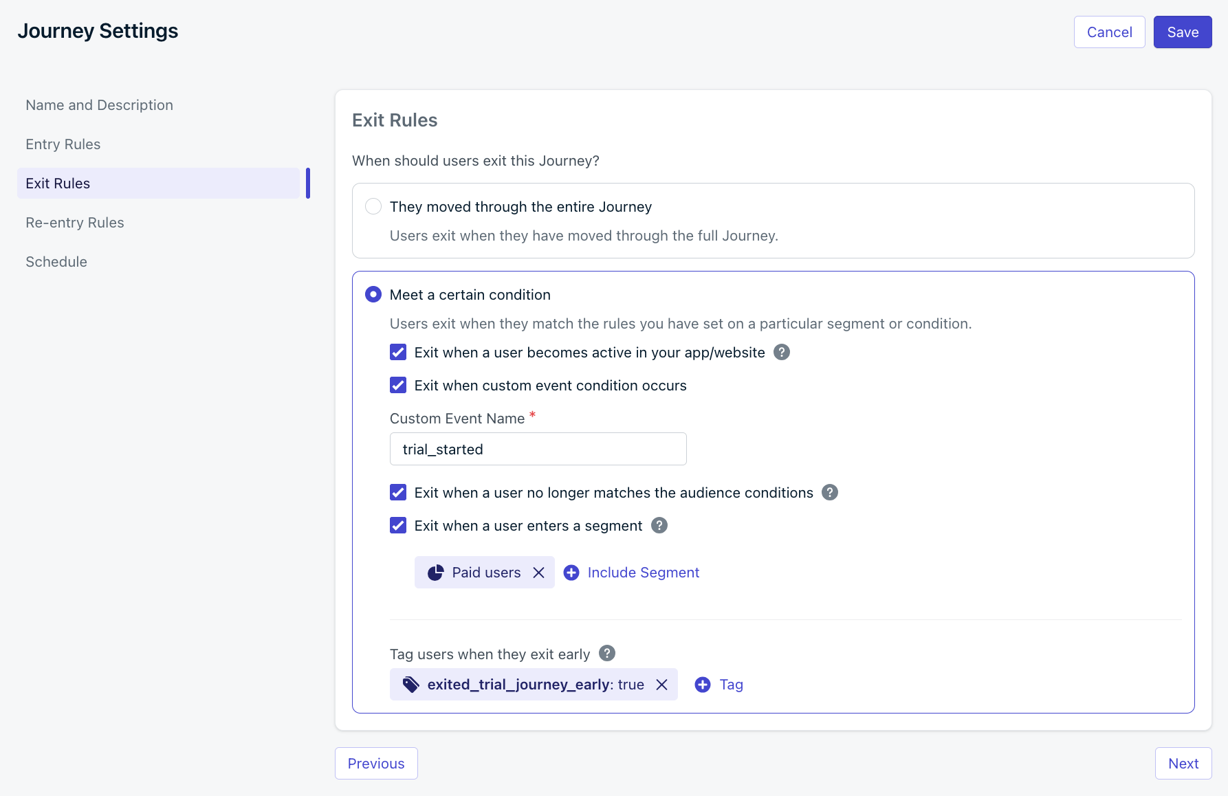 Exit rules define when users automatically leave the Journey. They may re-enter later based on your re-entry settings.